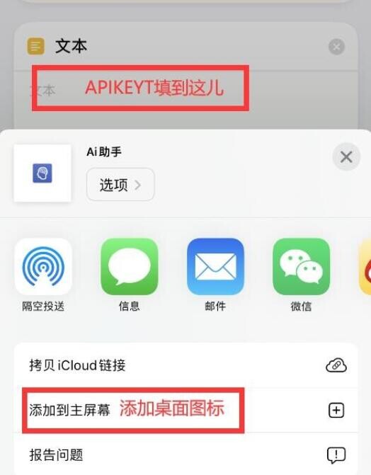 🔑 可以不填CHATKEY,CHATKEY是我们平台专属KEY,不填写KEY最多每日免费使用5次,如果您有KEY,请在快捷指令-AI助手-点击右上角在文本区域中填入,没有请购买或自行到官网注册账号获取,您可以点击快捷指令-AI助手-底部的分享按钮-创建桌面图标。